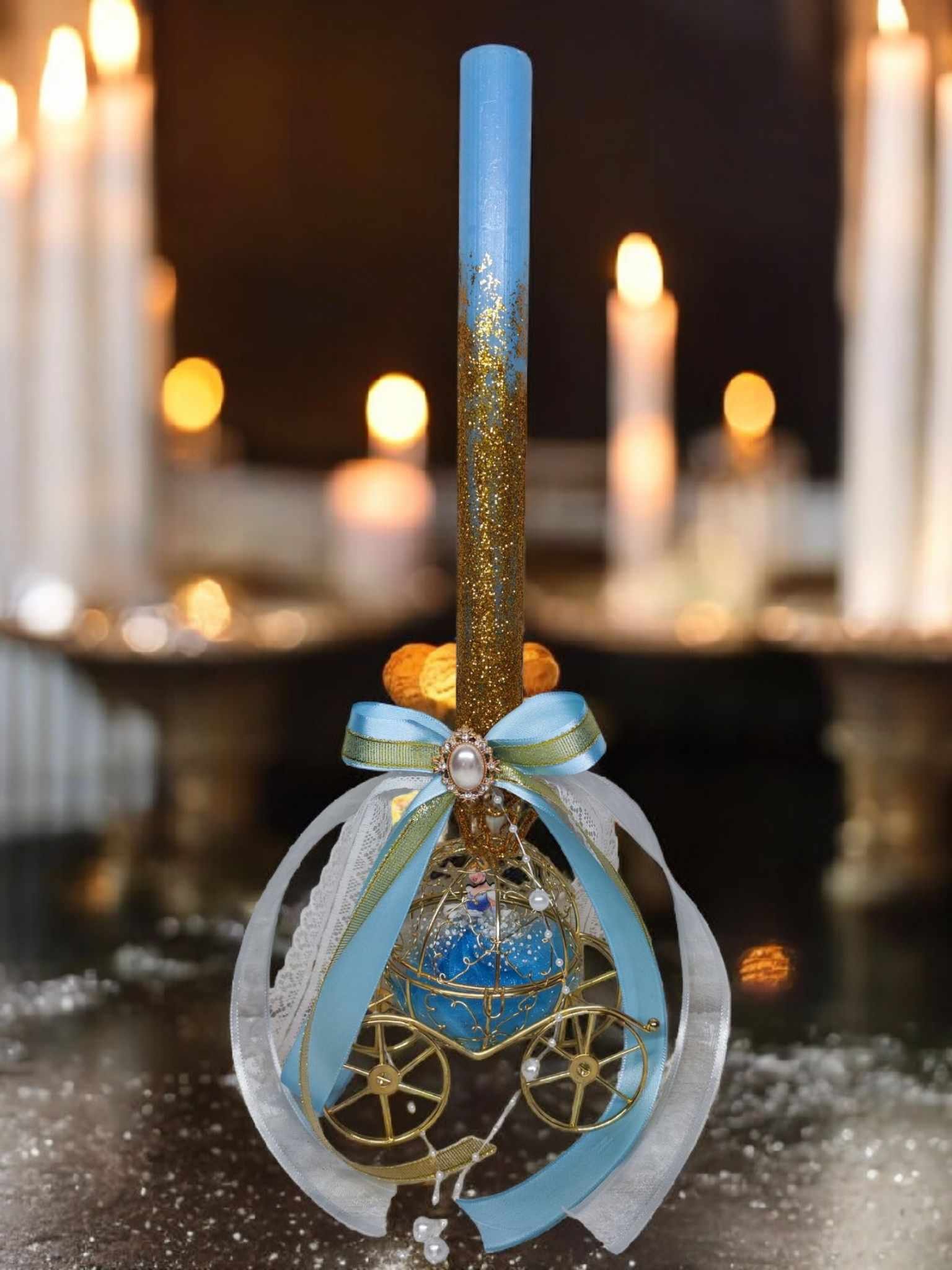 - Υλικό λαμπάδας: στρογγυλό αρωματικό κερί σε χρώμα σιέλ με χρυσό γκλίτερ.