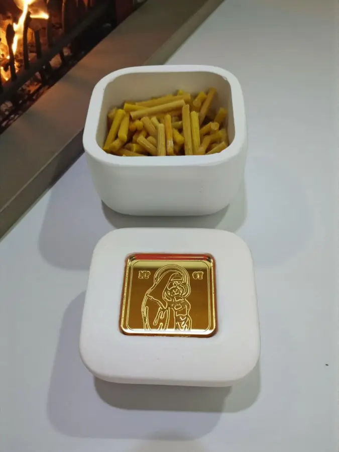 Κουτάκι με καπάκι και πλεξιγκλάς Παναγία, ιδανικό για να αποθηκεύσετε τα φυτιλάκια,καρβουνάκια ή άλλα μικρά είδη.