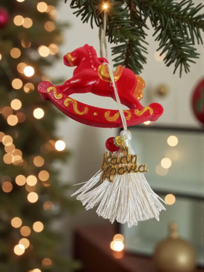 Δίπλα του, το μικρό πορσελάνινο αλογάκι σκορπά ευχές, τύχη και παιδική χαρά ,έτοιμο να στολίσει το δέντρο ή να γίνει το γούρι της χρονιάς. 🎄