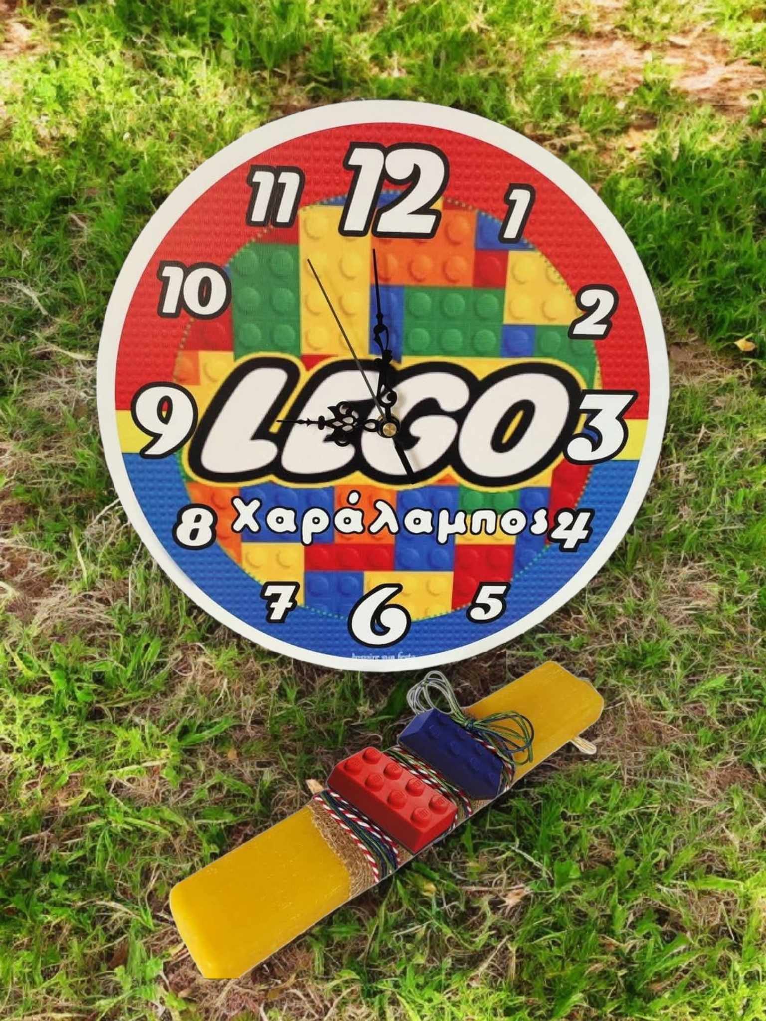 Προσωποποιημένο σετ αρωματικής λαμπάδας με ξύλινο ρολόι τοίχου και όνομα,με θέμα τα Lego!!