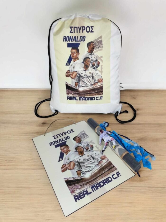 Προσωποποιημένο σετ αρωματικής λαμπάδας με ξύλινο διακοσμητικό καδράκι και σακίδιο πλάτης για όλες τις δραστηριότητες,με θέμα τον αγαπημένο ποδοσφαιριστή των παιδιών, Ronaldo!